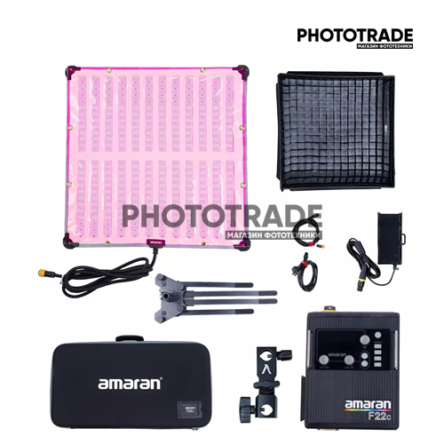 • Гибкая светодиодная панель Aputure Amaran F22c RGBWW 2500-7500°K — Эластичная подложка делает хранение и транспортировку осветителя более простой, а также есть возможность самому выбрать форму распространения луча вплоть до 360°. В комплекте уже предусмотрен софтбокс с сотами и два рассеивателя при помощи которых вы сможете получить нужную плотность света. В настройках освещения можно выбрать один из 15 художественных эффектов, а также настроек 46 настроек цвета.
