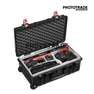 - В кофр помещается профессиональная DSLR-камера с установленным объективом 70-200 мм f2.8, второй камерой и 4-5 дополнительными объективами. IP67 тесты подтверждены: пыль не проникает внутрь, временное погружение в воду на 30 минут.